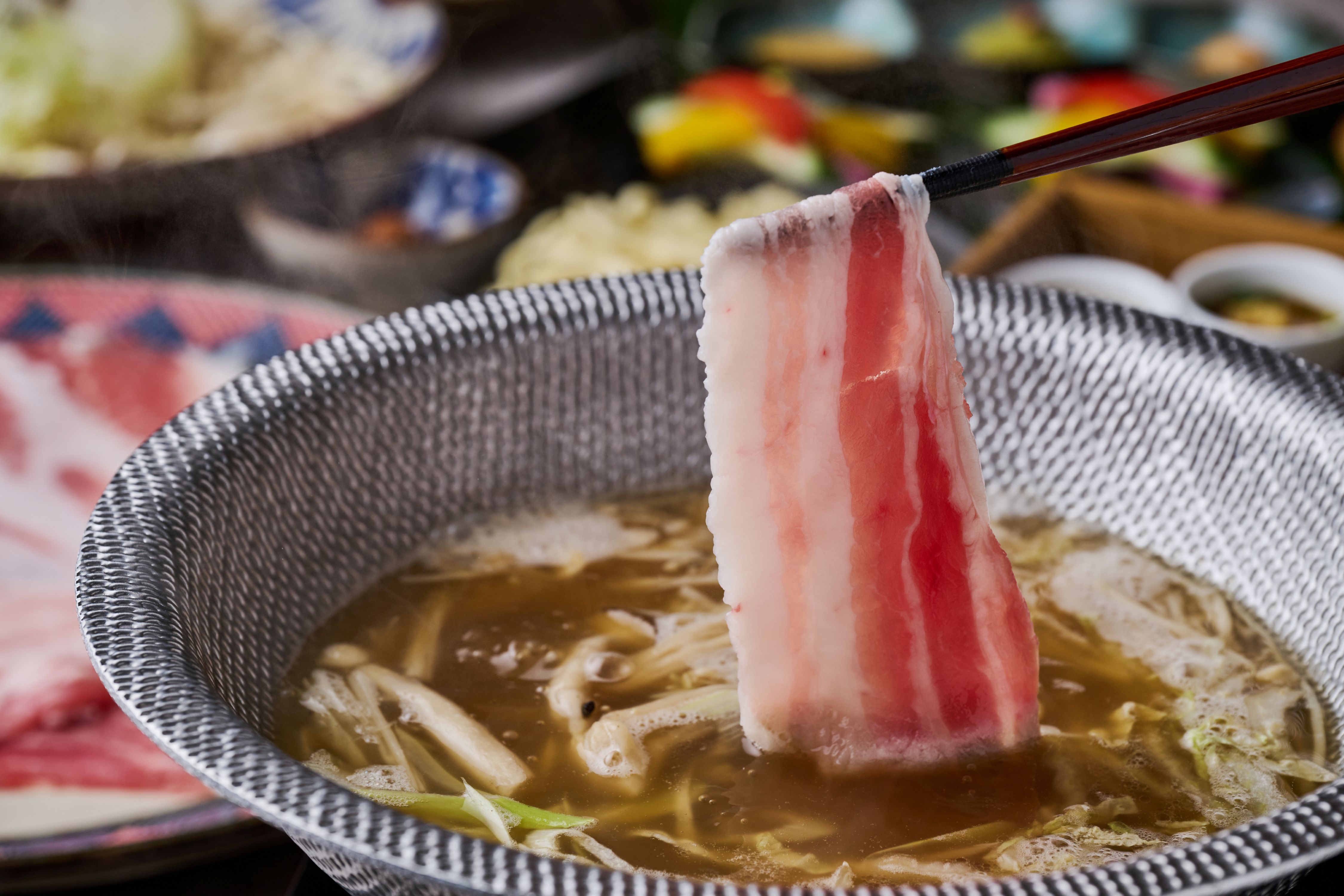 さっぱりとした旨味が特徴の「あぐー豚」をお出汁で味わうしゃぶしゃぶに、シェフが培った多国籍料理のエッセンスを重ねたコースをご用意しております。しゃぶしゃぶでご用意するお肉は変更・お替りも自由。当レストランでしか味わえない、こだわりの”お出汁”でいただく贅沢なしゃぶしゃぶをご堪能ください。